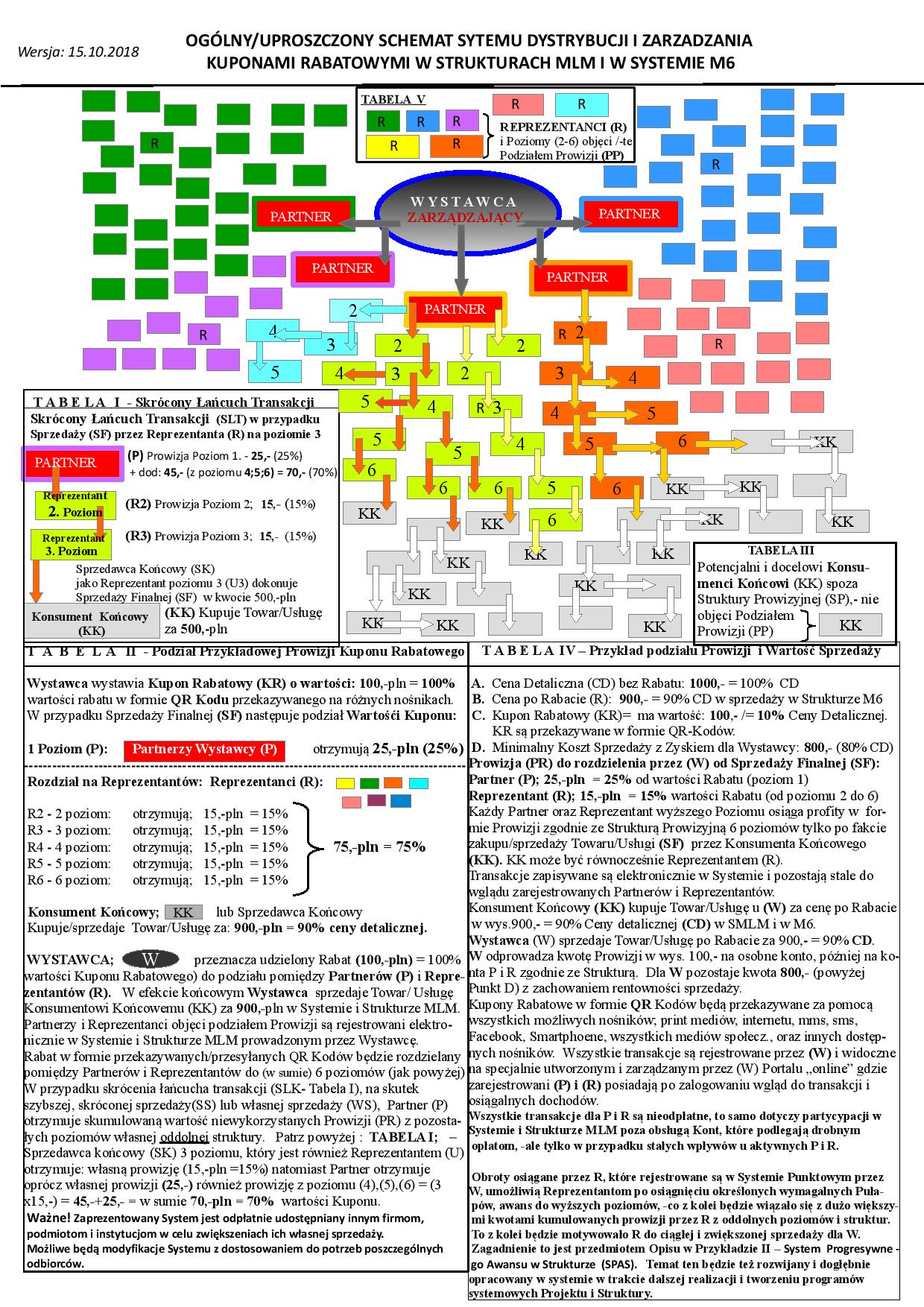 MJ6 jest programem umożliwiającym nie tylko otrzymywanie konkretnych profitów w udzielanych rabatach w formie „Kuponów Rabatowych”, - nasz program umożliwia również nieograniczone rozdzielanie i stałe wypłaty przyznanego Rabatu/Prowizji przez Wystawcę (W) „Kuponu Rabatowego” według odpowiedniego klucza umożliwiającego każdemu Uczestnikowi przedmiotowego programu konkretną partycypację w całości lub części udzielonego Rabatu. Nasz program MJ6 umożliwia Ci nie tylko dostęp do wielu produktów i usług po obniżonej, preferen-cyjnej cenie, ale również, w przypadku kiedy nie dokonujesz zakupów, będziesz automatycznie i samoistnie profitował finansowo w strukturze, która często powstanie i zostanie utworzona bez Twojego udziału, np. w wyniku tylko jednego polecenia. Szczegóły zobaczysz na naszej stronie www. pod zakładką: „Budujemy własną Strukturę”. Zależnie od Twojej aktywności oraz od stopnia Twojego zaangażowania, Program MJ6 stwarza Ci możliwość, poza czerpaniem konkretnych profitów z samej wielopoziomowej Struktury, również awans w Strukturze MJ6. Obroty generowane przez Ciebie lub przez osoby, które za Twoją bezpośrednią lub pośrednia przyczyną znalazły się w Strukturze, rejestrowane będą w Systemie Punktowym co, umożliwi Ci po osiągnięciu określonej liczby punktów, awans do wyższych poziomów w Strukturze. To z kolei będzie wiązało się z dużo większymi kwotami kumulowanych przez Ciebie prowizji z oddolnych pułapów; tzw. „Levels”. Przykładowe graficzne przedstawienie Ogólnego Schematu Systemu MJ6 Dystrybucja i Zarządzanie Kuponami Rabatowymi w Strukturach MLM.